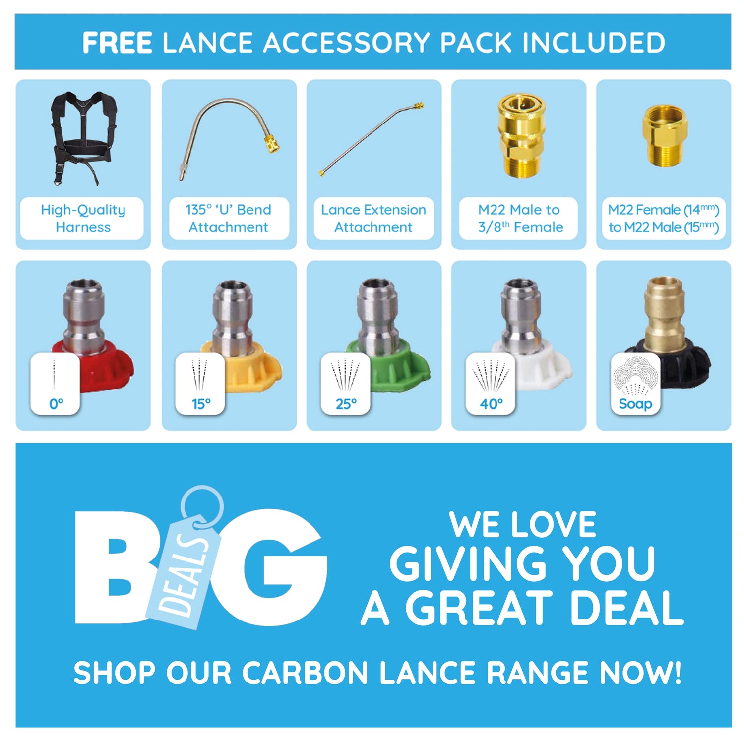 PREMIUM GRADE CARBON FIBRE TELESCOPIC LANCE WITH 5 ASSORTED NOZZLE ATTACHMENTS, STRAIGHT & 'U' BEND LANCE EXTENSION PLUS FREE BELT HARNESS!